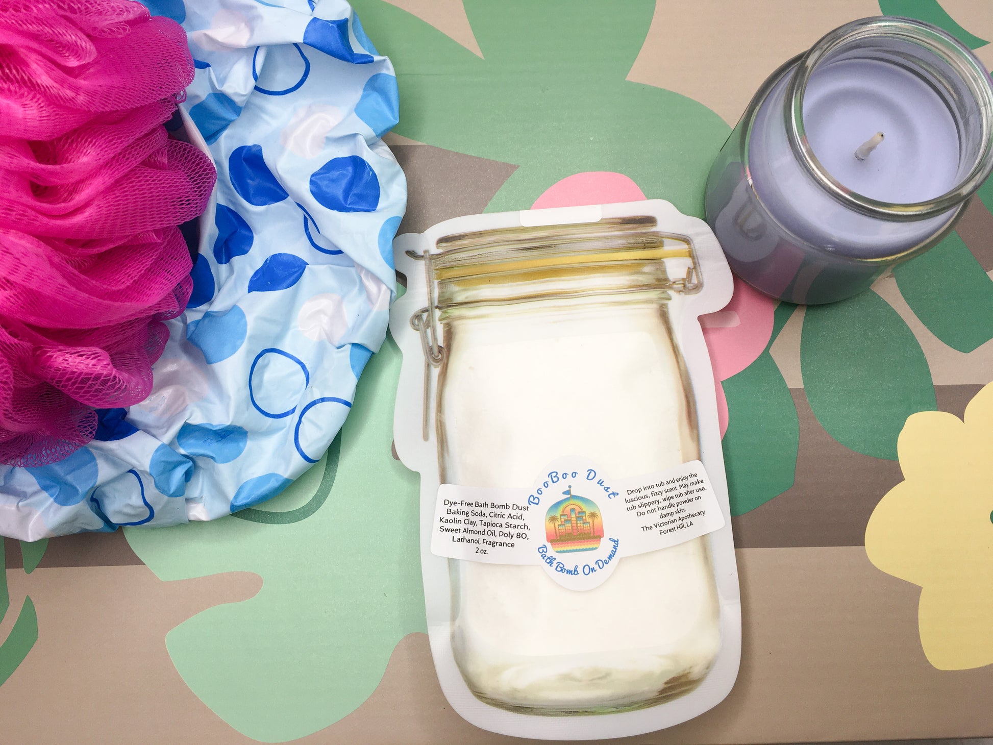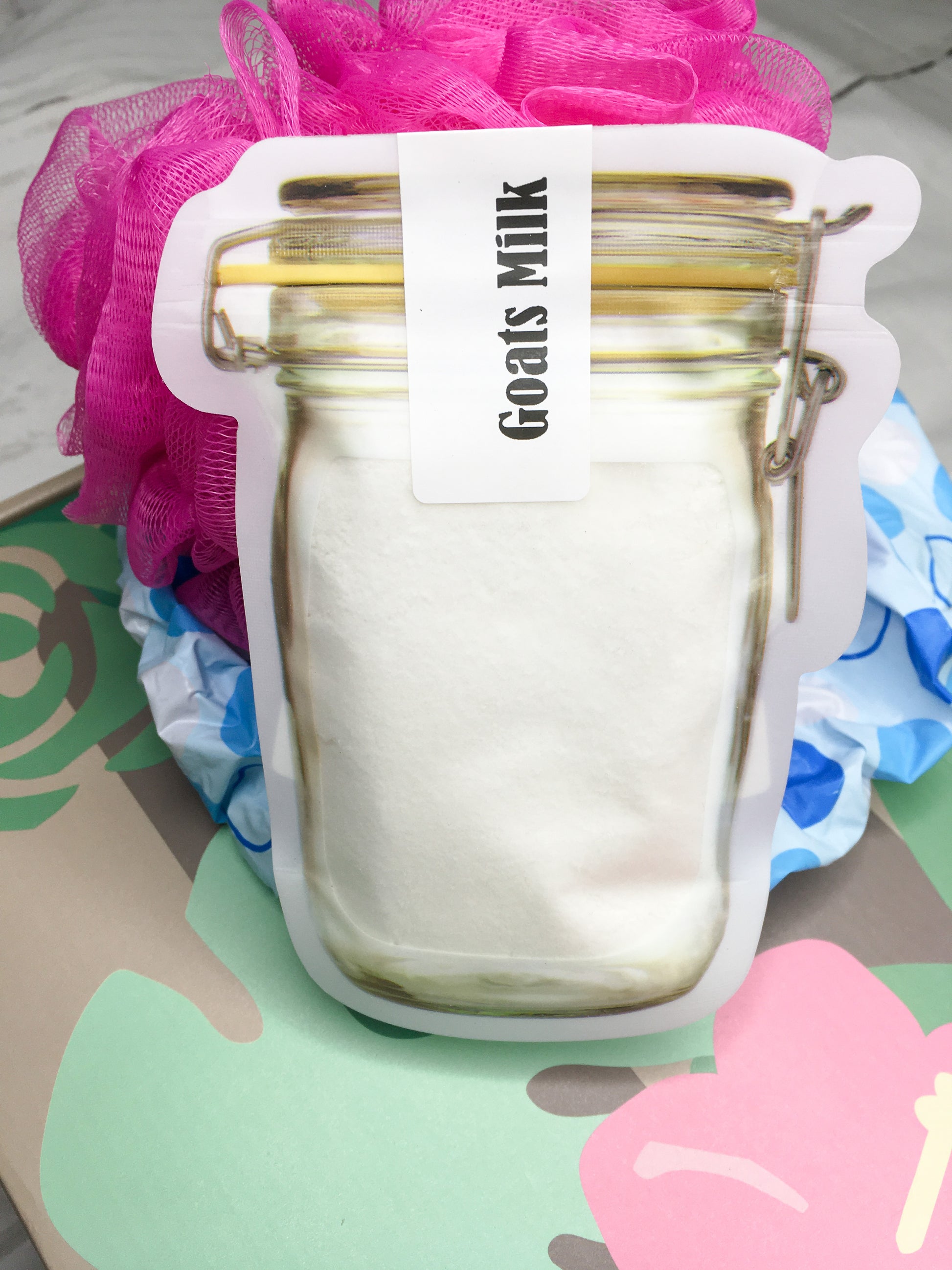 Ingredients in Goats Milk: Dye free bath bomb dust, baking soda, citric acid, kaolin clay, tapioca starch, sweet almond oil, polysorbate 80, fragrance, lathanol.