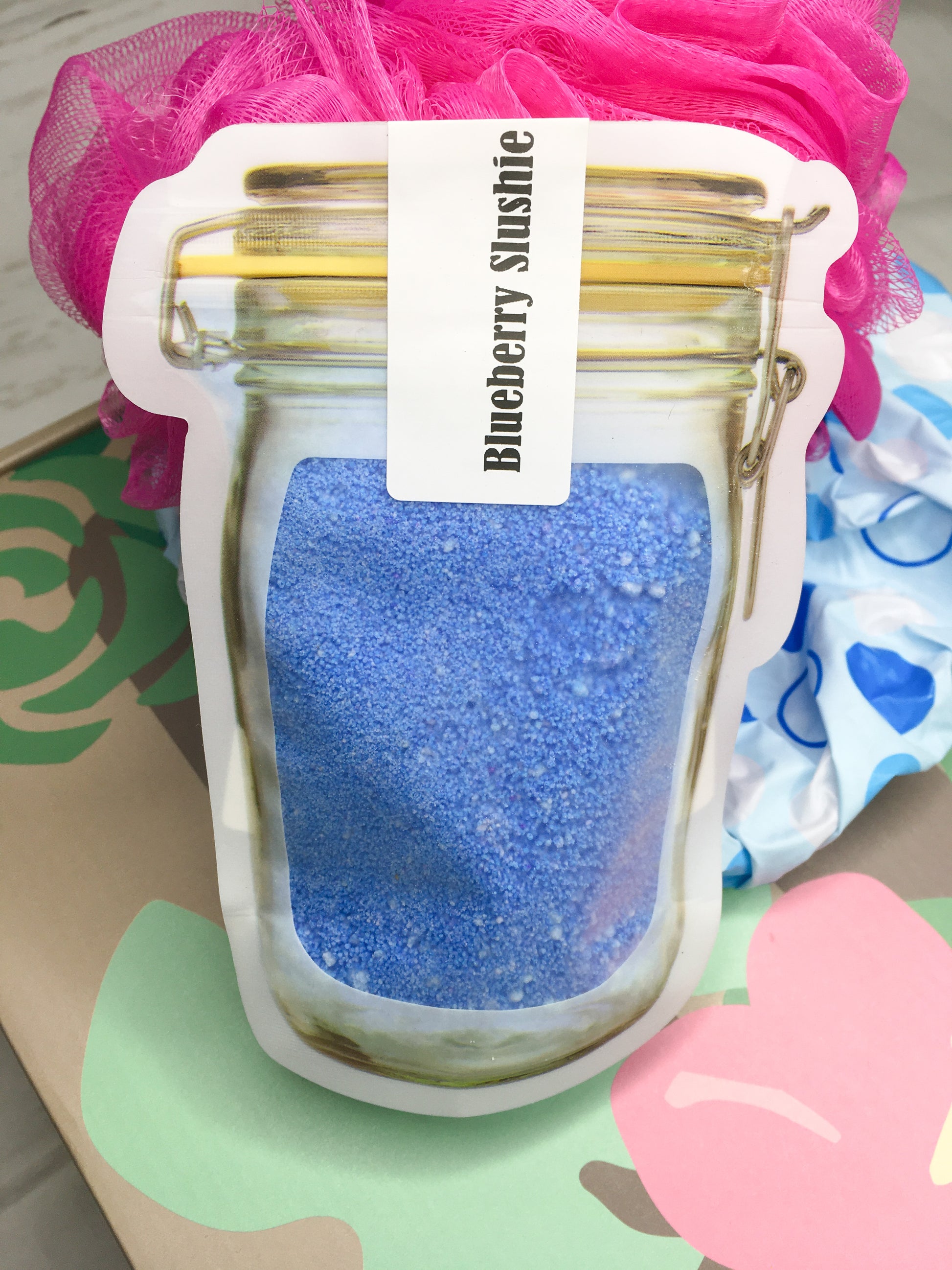 Ingredients in Blueberry Slushie: Baking soda, citric acid, kaolin clay, tapioca starch, sweet almond oil, polysorbate 80, FD&C Blue 1 and fragrance, lathanol, yellow 1 lake, red 28 FD&C.