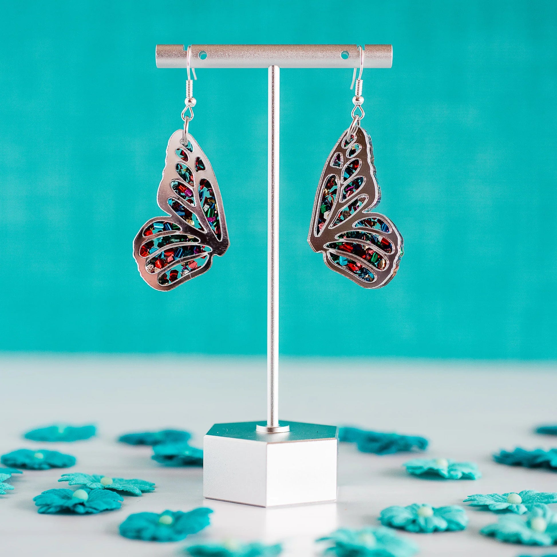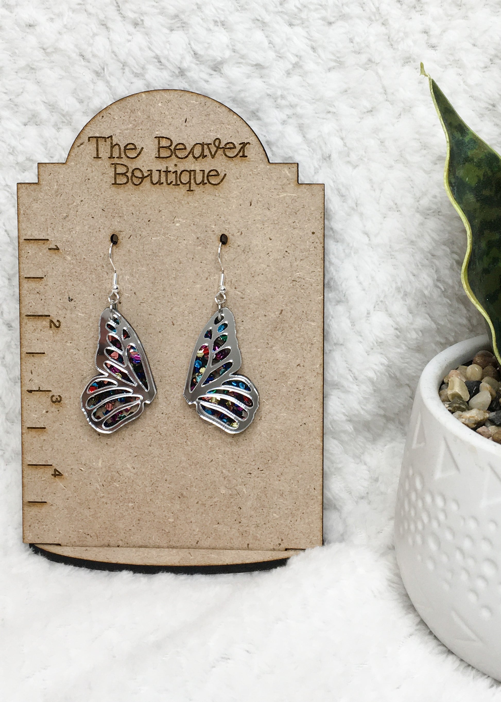 Butterfly silver skipper earrings are made with layered acrylic, 3/16 in thick & 1.5 inch length. Great for sensitive ears! A must for any butterfly lover.
