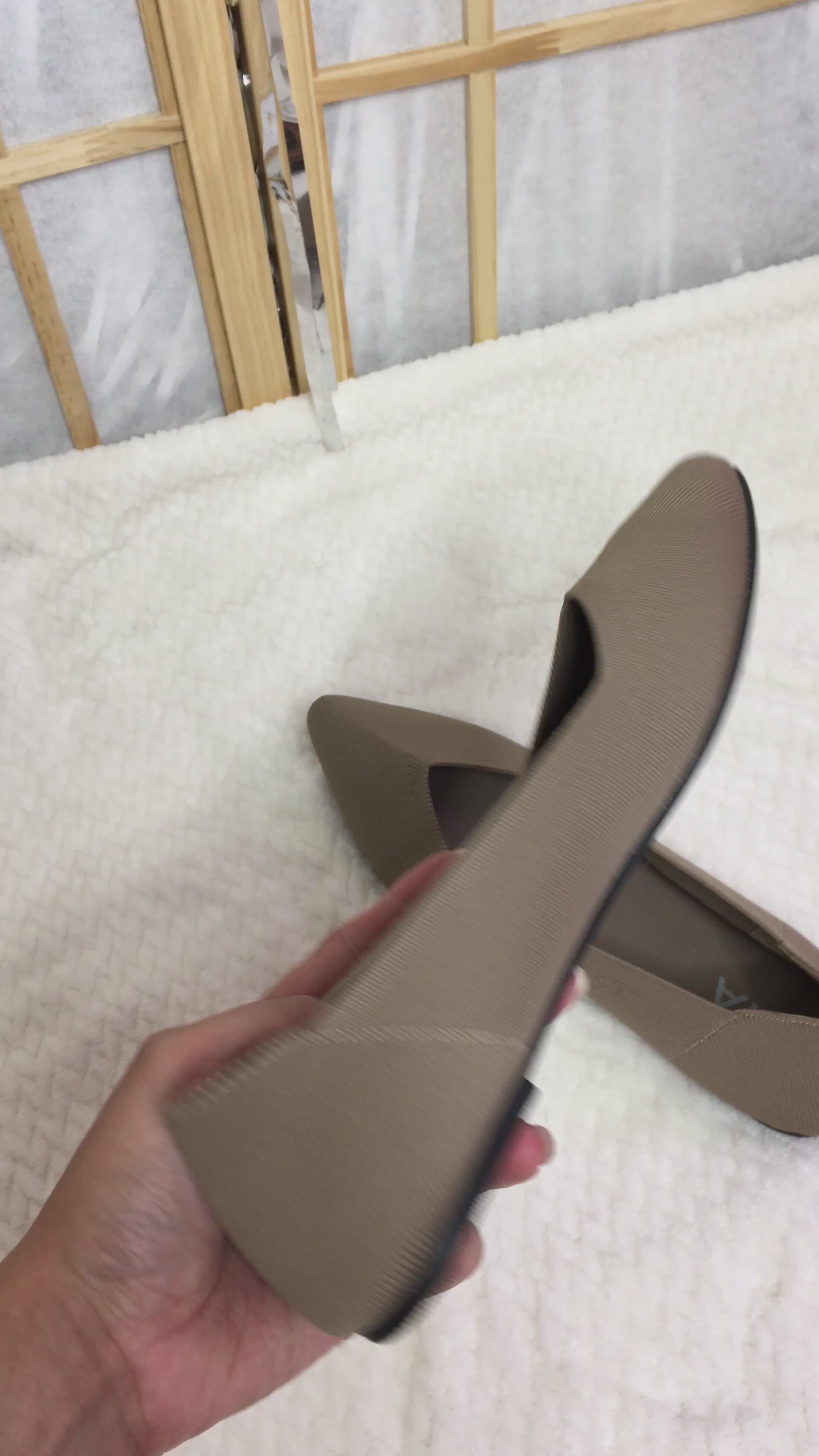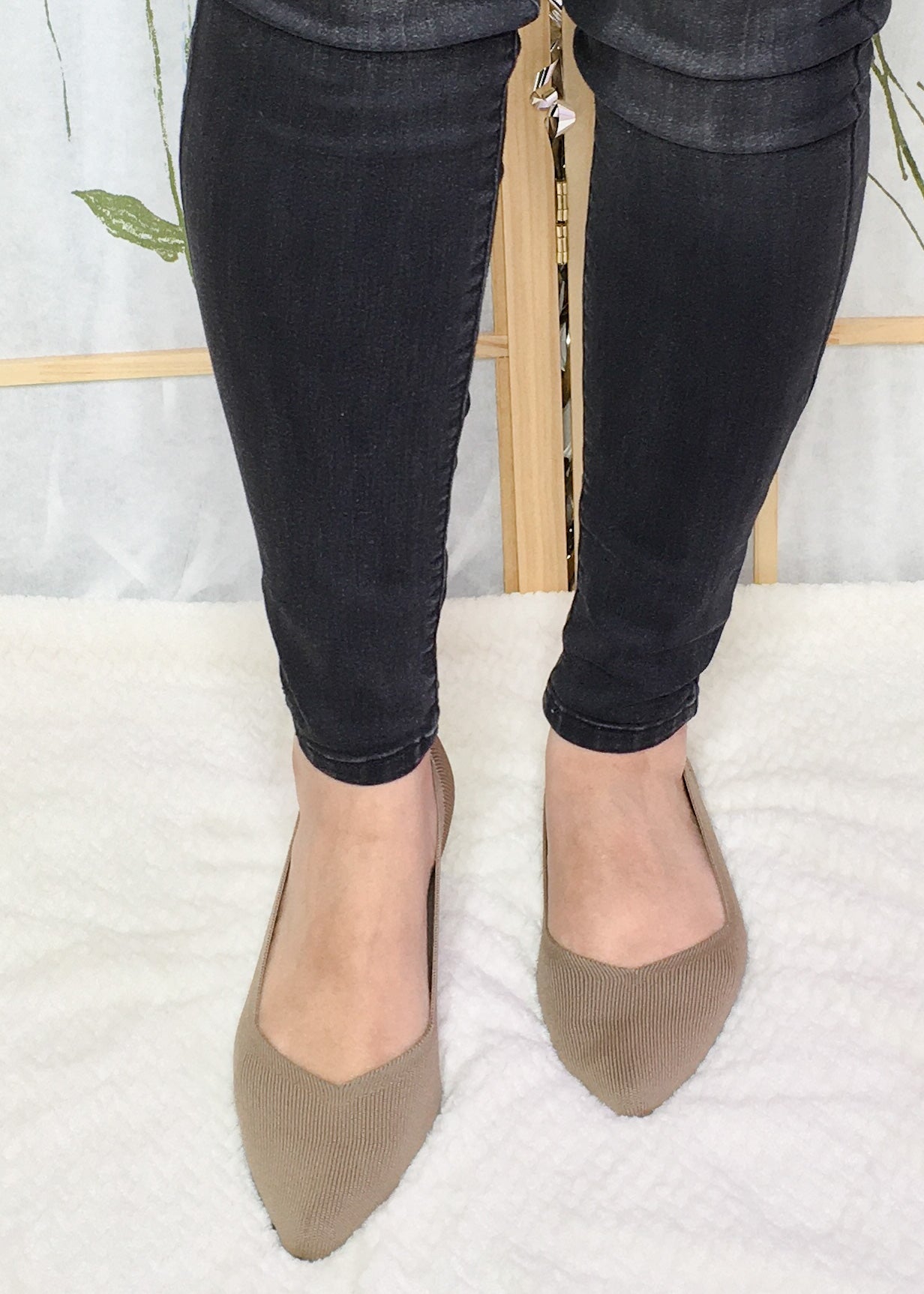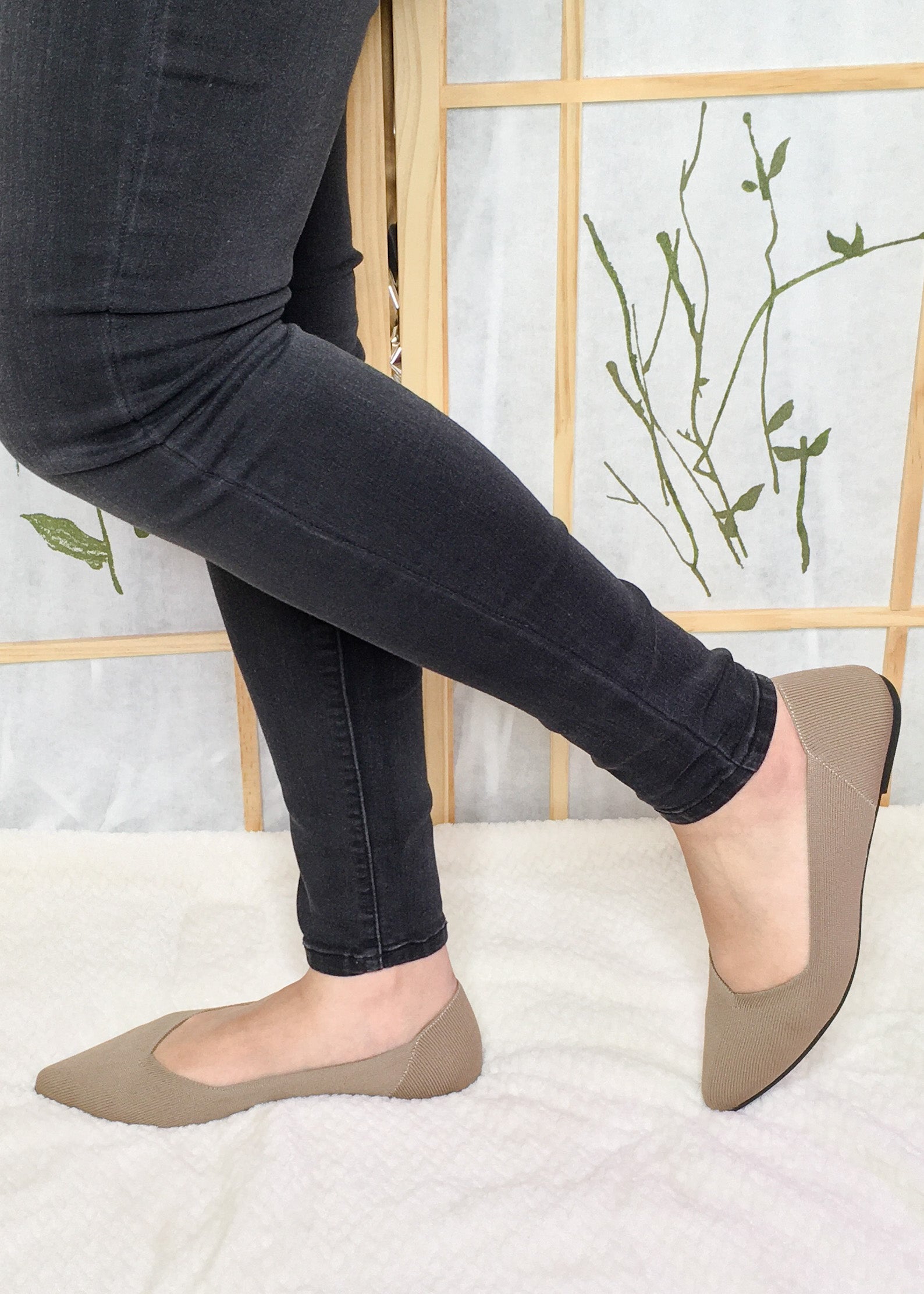 Step into comfort with this slip on knit pointy dark sand flats. Cushioned insole and stretch knit fabric accommodates your foot for comfortability, style and versatility.