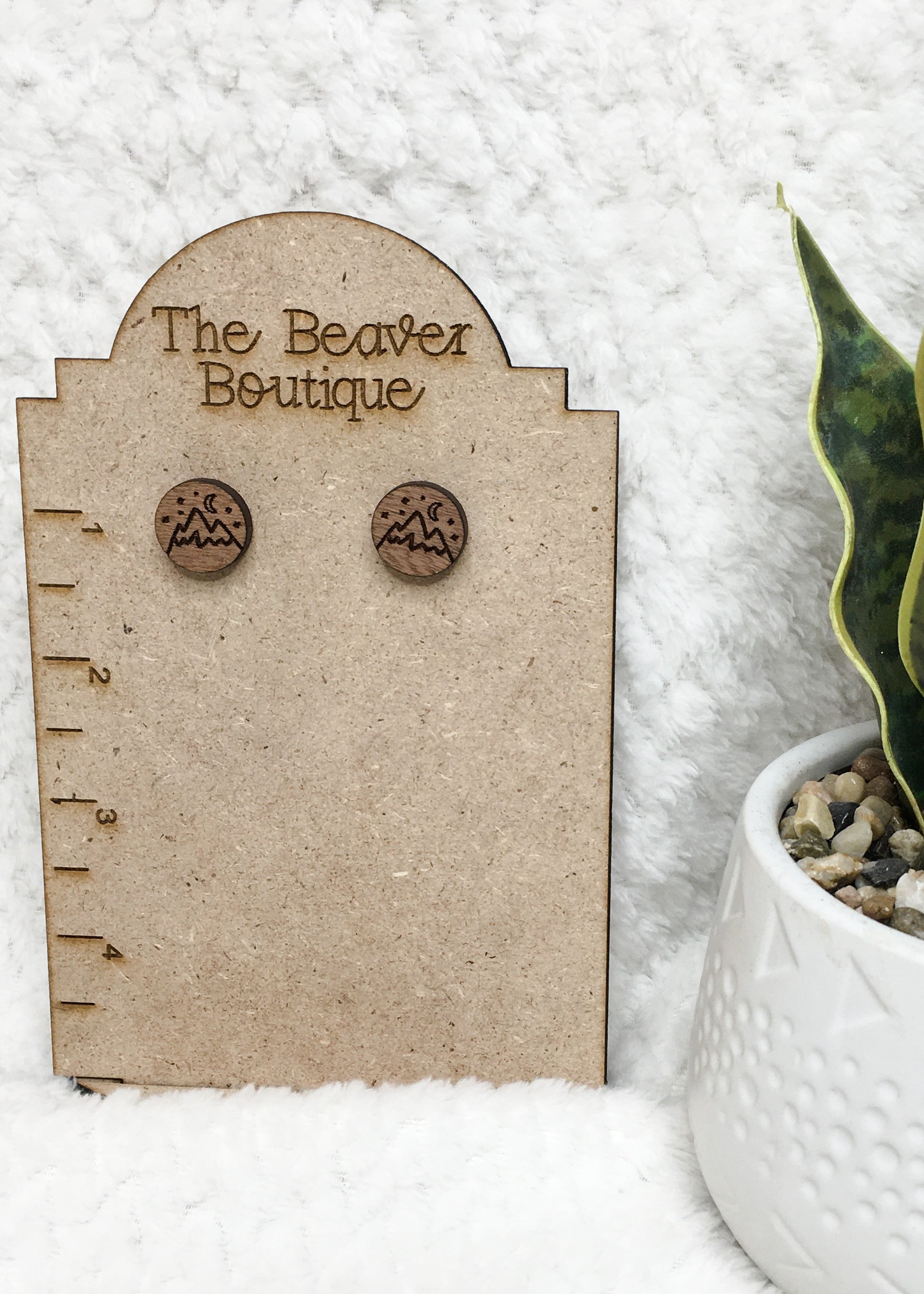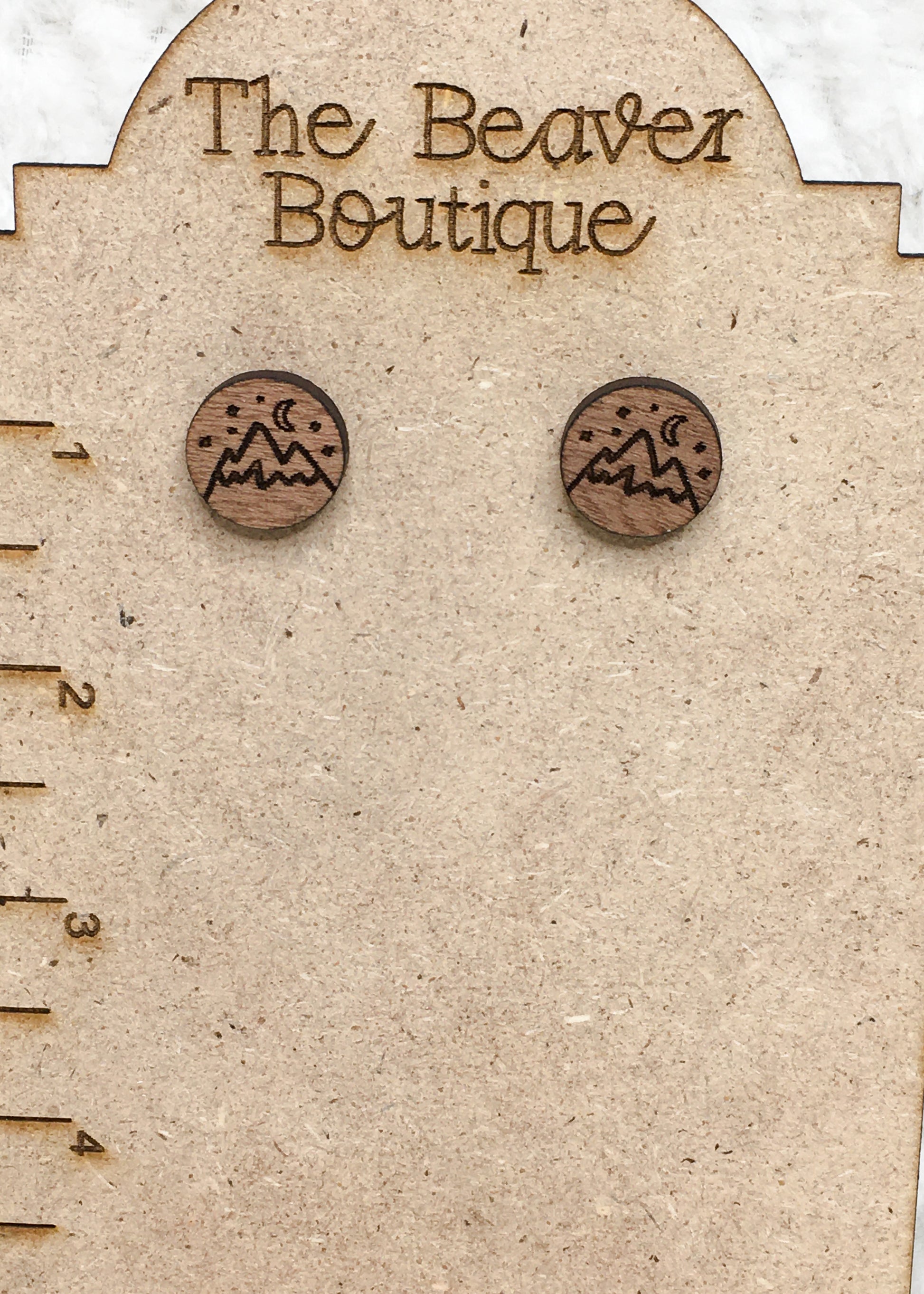 Reach for the peak of the mountains with these hand drawn, laser cut and engraved wood studs. Great for sensitive ears! Great gift for the outdoorsy person you know.