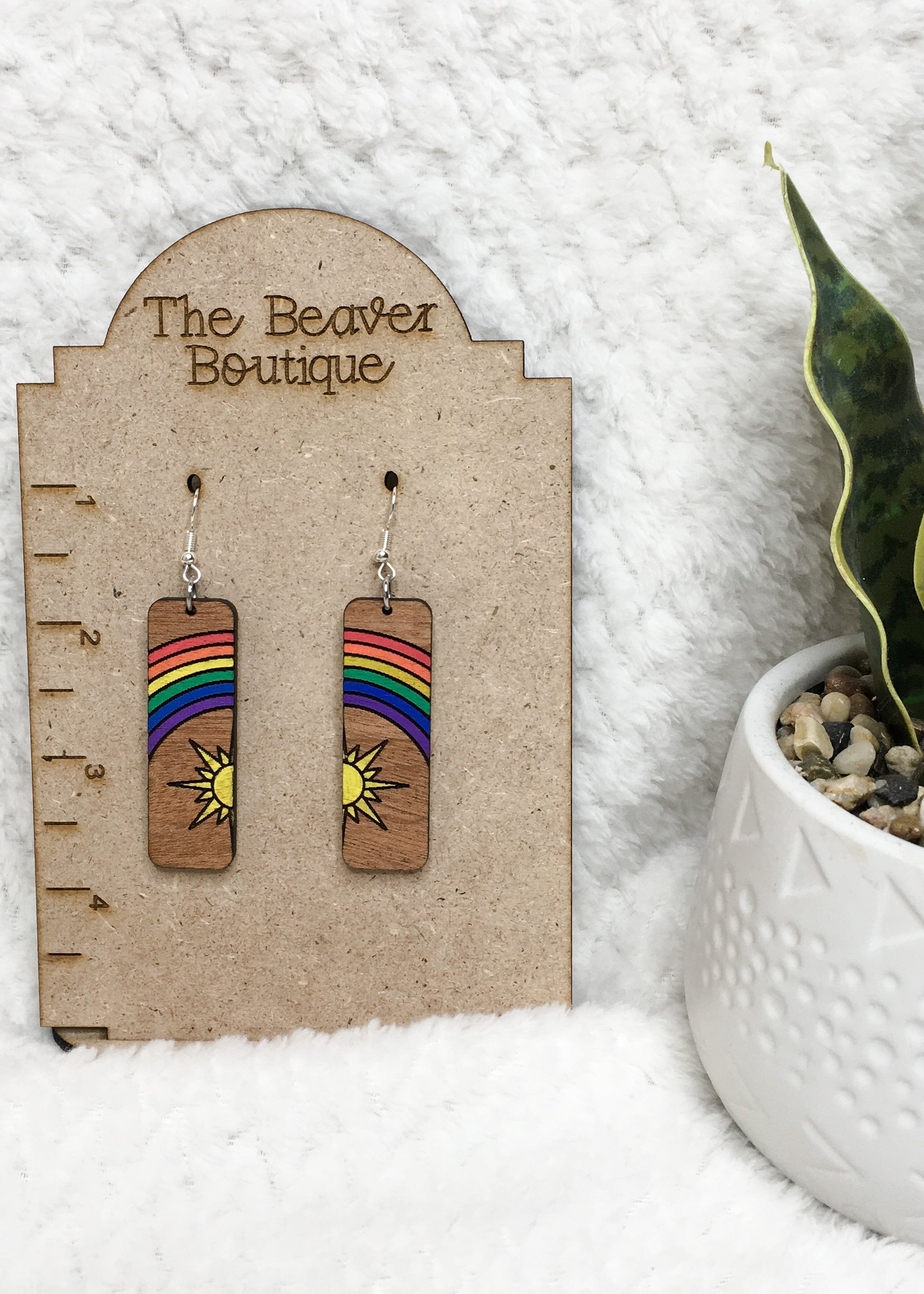 Rainbow and sunshine are these beautiful hand painted bar dangle earrings. 2 inch length. Great for sensitive ears and will definitely brighten your day.