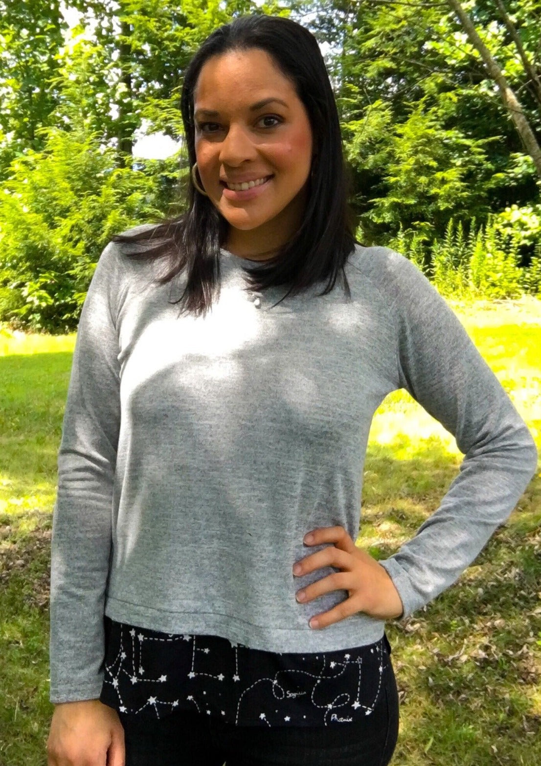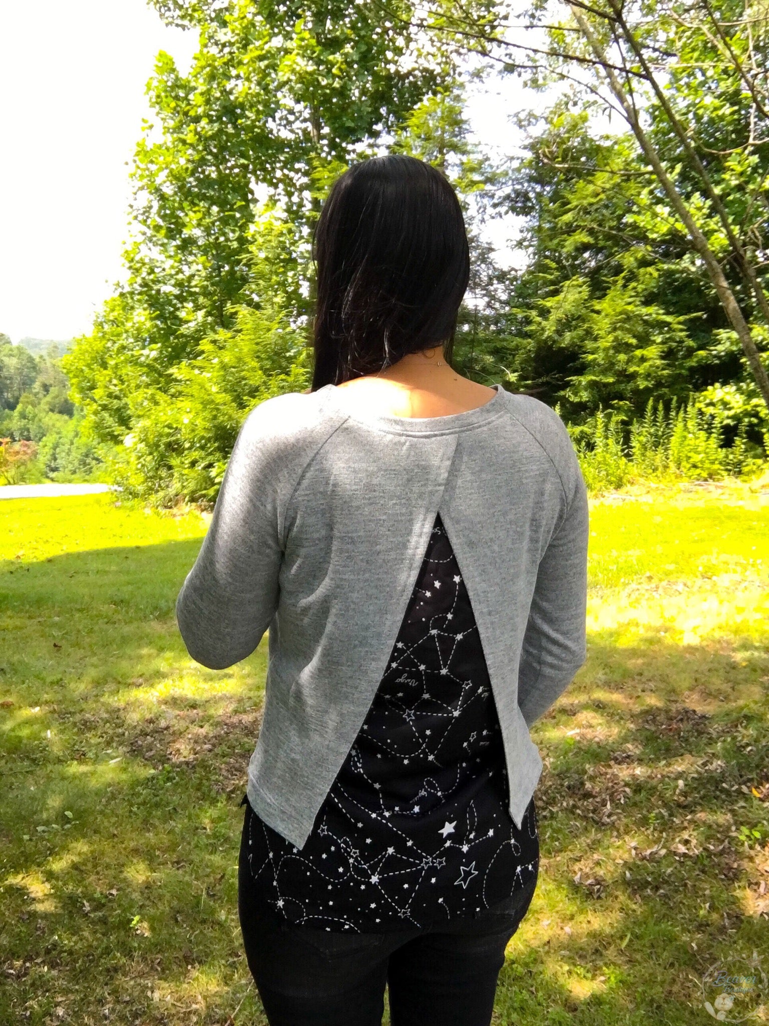 Have a piece of the skies with you while wearing this beautiful long sleeve top. Great split back showing the constellations, and also a sneak peek in the front.
